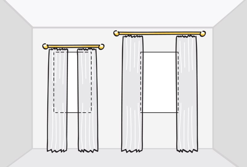 Настенные конструкции устанавливают на 10–15 см выше оконного проема. Если закрепить карниз ниже, то он визуально уменьшит окно.